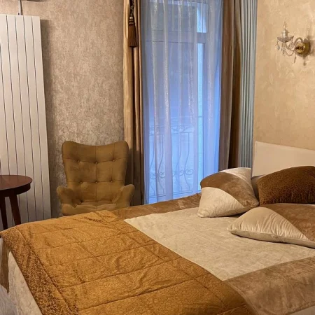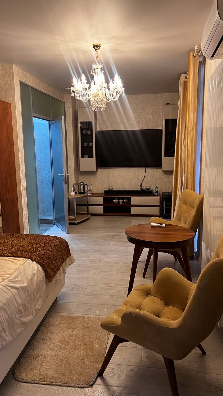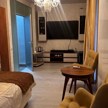 - Оснащение: 1 спальня,, кондиционер, журнальный столик, 2 кресла, зеркало, шкаф, телевизор, чайник, холодильник, набор посуды (2 тарелки, 2 чашки, 2 чайные ложки, 2 стакана), прикроватна тумба, тумба по телевизор, Wi-Fi
