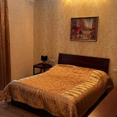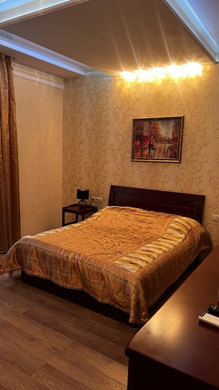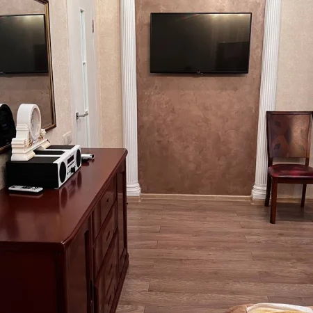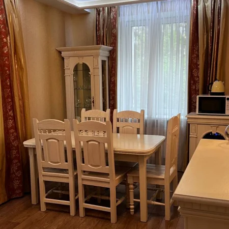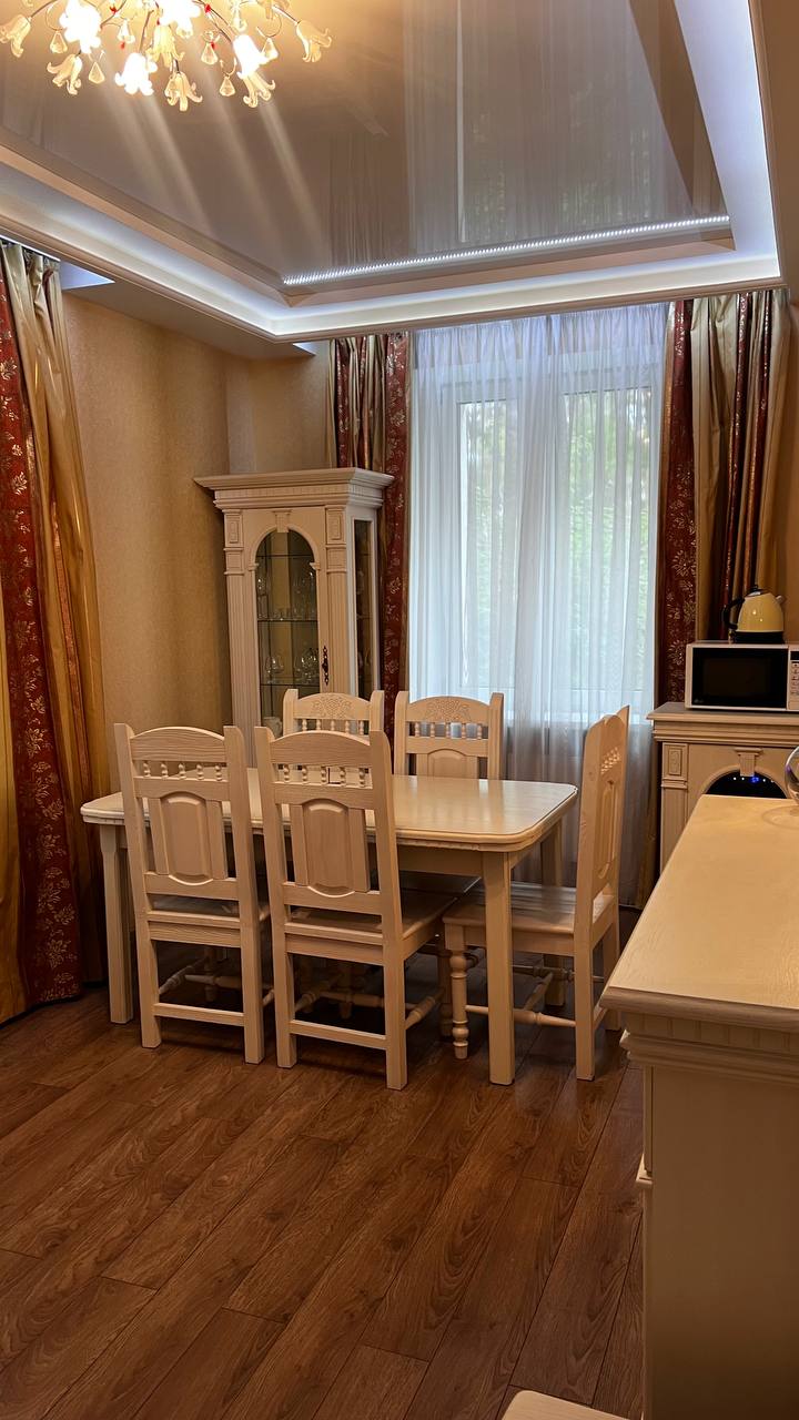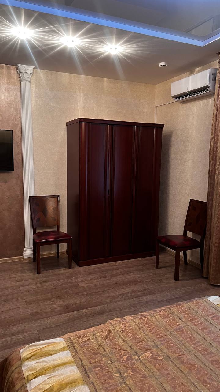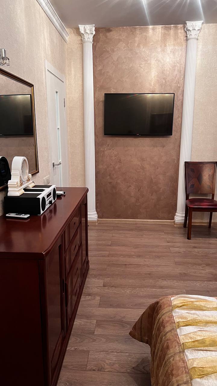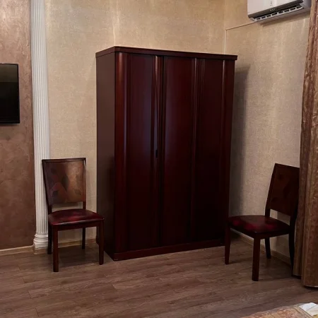 - Оснащение: 1 спальня, 1 гостиная, кондиционер, журнальный столик, 2 пуфика, 2 стула, зеркало, шкаф, вешалка для одежды, 2 комода, 2 телевизора, чайник, холодильник, обеденный стол, 5 стульев, набор посуды, 2 прикроватные тумбы, тумба для обуви, Wi-Fi