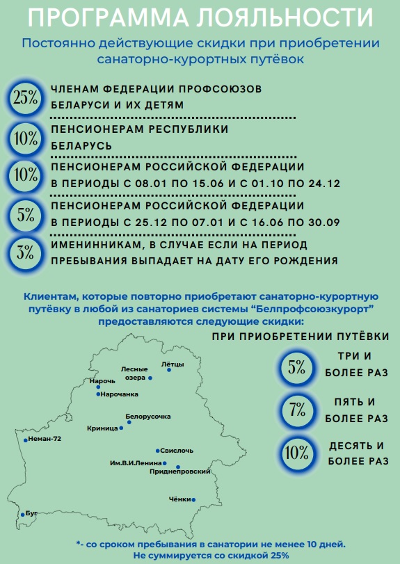 Детям не старше 14 лет (на дату заезда), кроме детей членов Федерации профсоюзов Беларуси, при санаторно- курортном лечении вместе с родителями или законными представителями, на основное место |